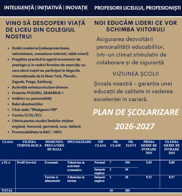 27 Aug 2025 Colegiul economic VIRGIL MADGEARU, cu sediul în BUCUREŞTI, str. Dacia, nr. 34, sector 1, în temeiul H.G. nr. 1336/2022, cu modificările și completările ulterioare, organizează concurs pentru ocuparea unui număr de 1 funcție contractuală vacantă, după cum urmează: